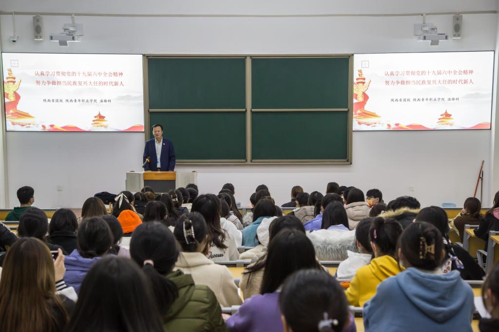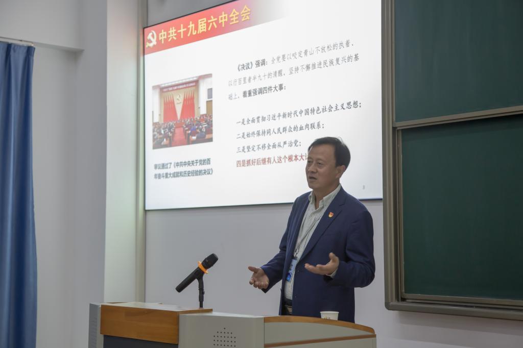 温锋科以《认真学习贯彻党的十九届六中全会精神 努力争做担当民族复兴大任的时代新人》为主题,从《中共中央关于党的百年奋斗重大成就和历史经验的决议》是一本权威的、高度凝练的党史教科书,青年大学生要认真学习、全面理解、把握实质;为党培养造就堪当时代重任的接班人,青年大学生要践行“请党放心、强国有我”青春誓言;认真学习贯彻党的十九届六中全会精神,青年大学生要坚定不移听党话、矢志不渝跟党走三个方面进行了深刻阐释和讲授。