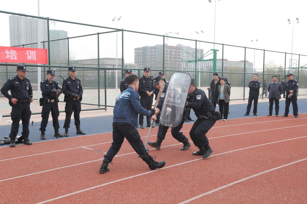教官首先给大家演示了遭遇刀斧砍人时盾牌的使用方法。要点是保持冷静,双手持盾高于头顶,双臂弯曲,上步推击,减少力矩,增加攻击力。接着向大家演示了防暴钢叉的使用方法,要点是紧盯犯罪嫌疑人身体移动角度,卡胸不卡腹。最后进行多人组合演练,在遭遇犯罪嫌疑人攻击时,要点是团结协作,服从持盾人指挥。演示中学员手持盾牌与手持长棍及钢叉队友形成三角队形,与其展开激烈搏斗,使用跪压技术,夺取其武器,最终控制“歹徒”。