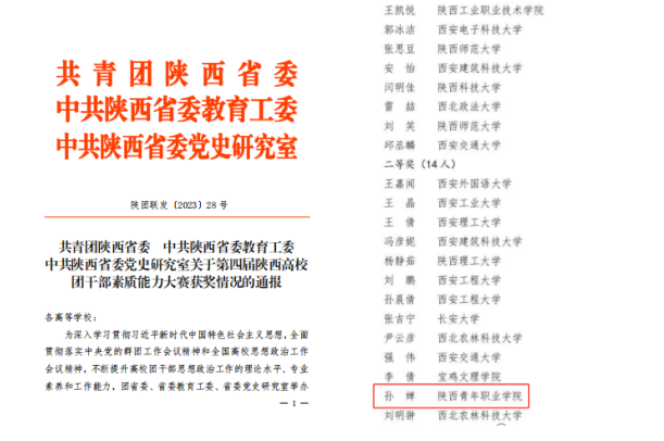 近日,共青团陕西省委、中共陕西省委教育工委、中共陕西省委党史研究室下发《关于第四届陕西高校团千部素质能力大赛获奖情况的通报》,数字经济与数字技术系辅导员兼团工委书记孙婵荣获“专职团干部组”二等奖。