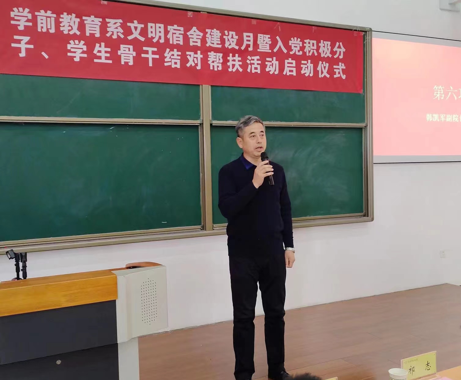 最后,韩凯军指出,学前教育系开展此次活动是切实落实新时代党的教育方针和为党育人、为国育才、立德树人政治责任的具体举措,非常有意义,也非常及时。通过学生入党积极分子、学生骨干与新生宿舍结对帮扶,从“小”宿舍出发,发挥“大”思政育人作用。同时,他对学前教育系全体学生提出两点期望:一是针对学前教育专业培养目标,找准个人定位,做好学业和职业规划,加强自我锤炼,努力把自己锻造成为专业能力突出、综合素质优秀的合格幼教工作者;二是认真领会本次活动开展的目的意义,从细微处着手,从点滴做起,守纪律、讲礼貌,与同学合力打造温馨、和谐宿舍的环境与氛围,展现学前学子的良好精神风貌,用实际行动践行“请党放心、强国有我”的青春诺言。(学前教育系/朱羽菲 供稿)