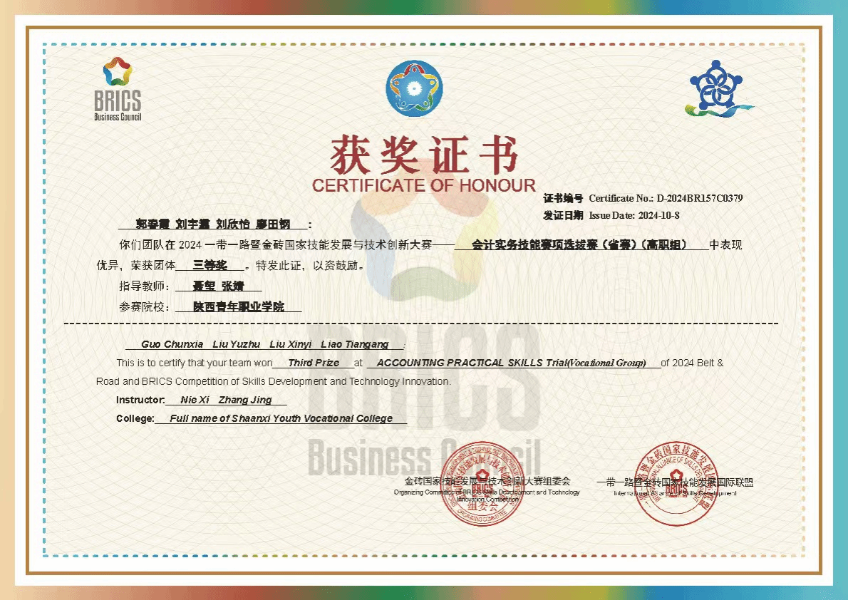 近日,2024一带一路暨金砖国家技能发展与技术创新大赛“会计实务”技能赛项(高职组)竞赛结果出炉,新葡数字经济与数字技术系2022级、2023级大数据与会计专业学生刘欣怡、刘宇翥、郭春霞、廖田钢、张克鸽、姜述艳、屈欣蕊、王洁等八位同学组成的两支参赛队伍,在聂玺、张婧两位老师的指导下,经过近两个月的紧张备赛,最终斩获三等奖和优秀奖。