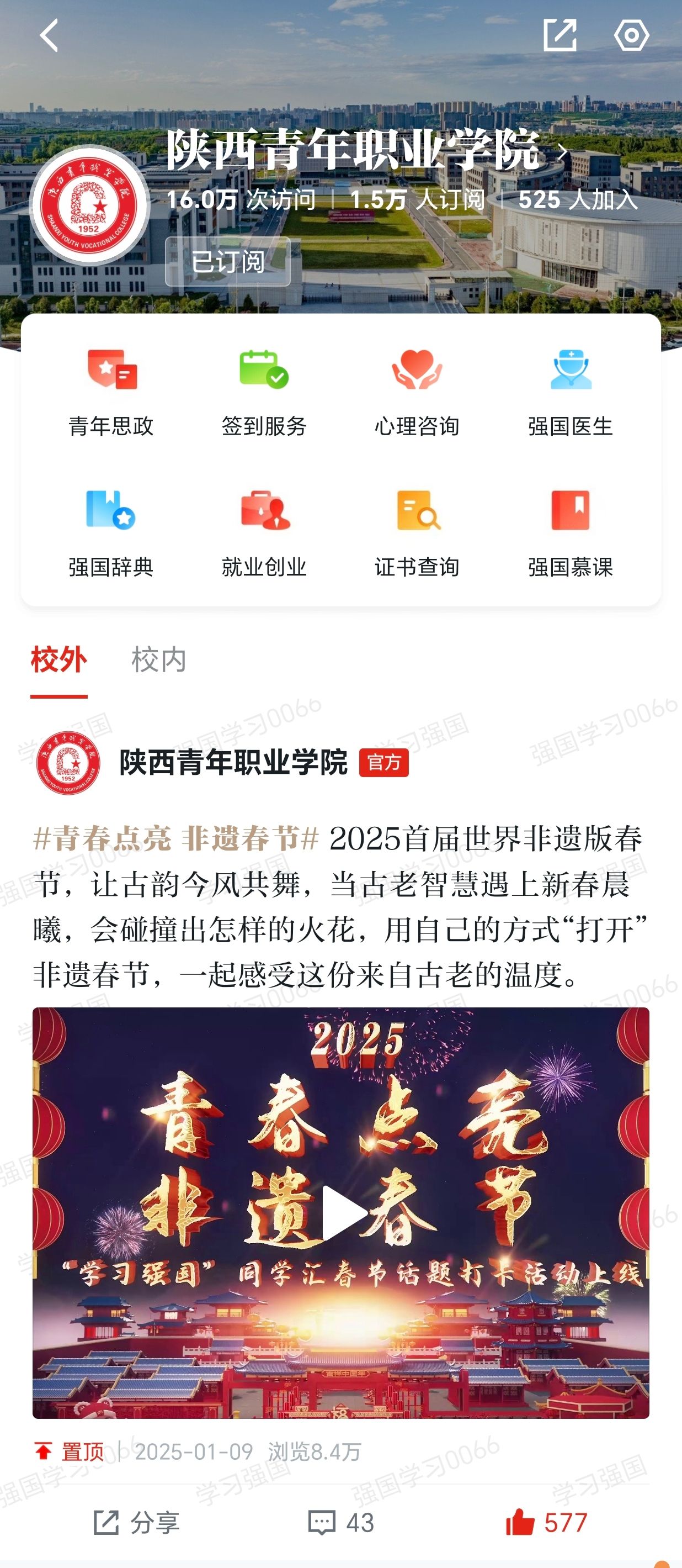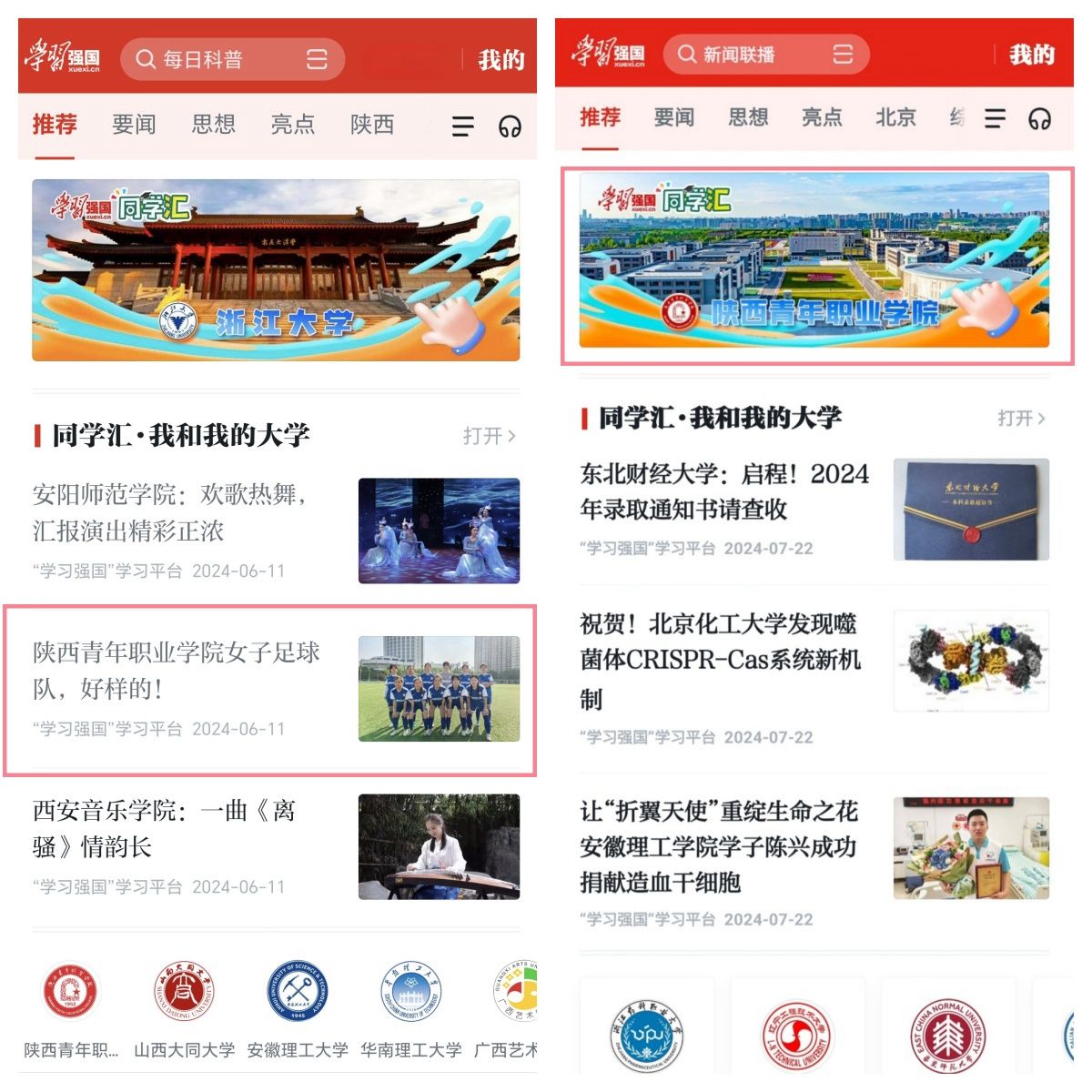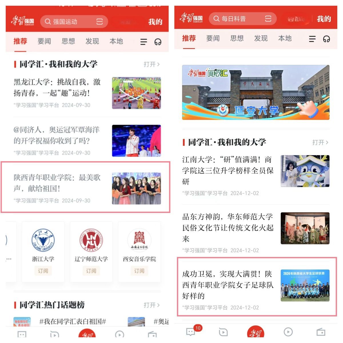 新葡自2023年9月开通“学习强国”同学汇以来,安排专人负责运营和维护平台,围绕党建思政、人才培养、教育教学、校园文化等方面积极创作、发布各类图文、短视频等作品,2023年度曾获同学汇人气作品奖一项。截止2025年1月,新葡同学汇首页访问量达16万,1.5万人订阅,2024年共6次荣登同学汇全国高校排行榜单前50名,7次荣登人气作品榜单全国高校前100名,13次被学习强国同学汇首页推荐,进一步扩大了学校的美誉度和影响力。