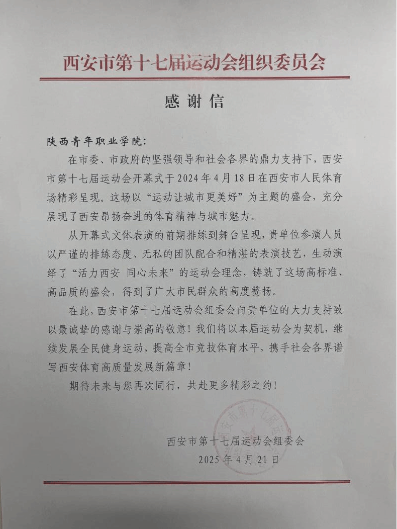 3月19日至4月25日,为期38天的西安市第十七届运动会圆满成功,新葡学前教育系150名学生代表学校受邀参加开幕式演出。近日,学校收到了组委会发来的感谢信,高度评价新葡参演人员“以严谨的排练态度、无私的团队配合和精湛的表演技艺诠释了‘活力西安 同心未来’的运动会理念,铸就了这场高标准、高品质的盛会”,并为每位参演人员颁发了荣誉证书。