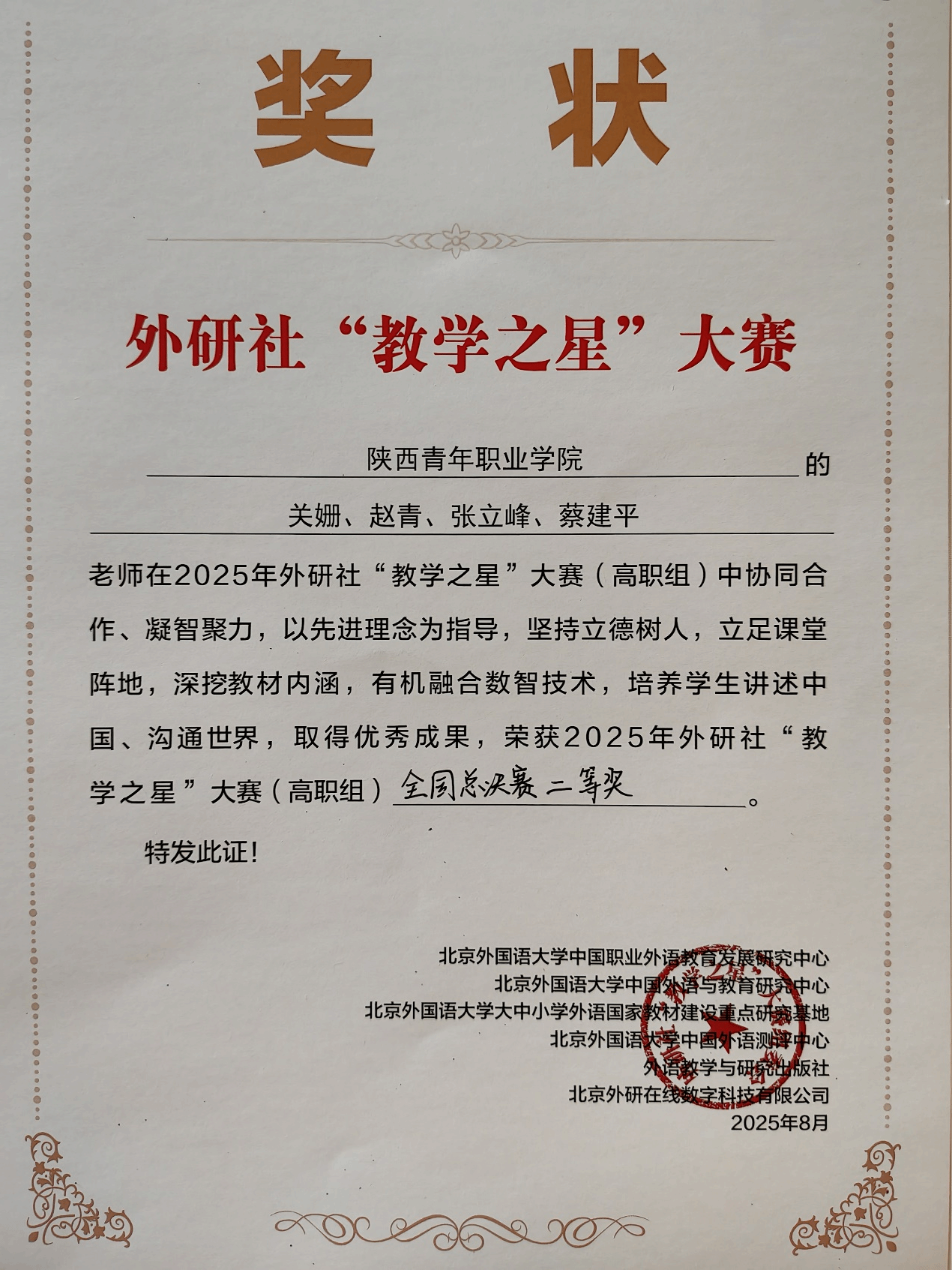 大学英语教研室将以此次获奖为契机,继续深入探索数智化时代背景下高职英语教学改革的有效路径,不断深化教学创新,提升人才培养质量,为学校高质量发展贡献更大力量。(公共课教研部 /张立峰 供稿)