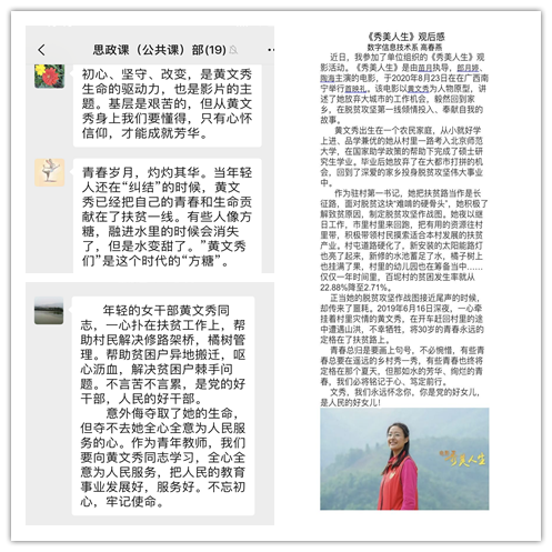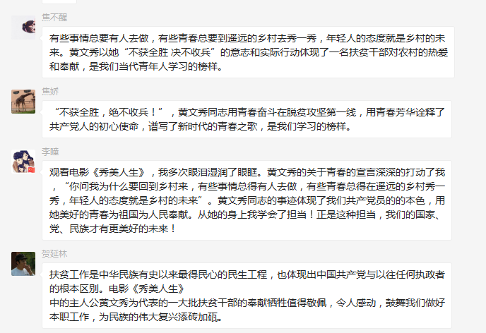 在近2个小时的观影时间里,大家都感佩于影片中一个个脱贫励志的故事,更被黄文秀身上的那股韧劲、那股精神以及她对贫困群众的深情所震撼,她的感人事迹在广大党员干部群众中引发强烈反响,在观影后,采用线上线下各种形式交流讨论观影体会。大家纷纷表示,黄文秀作为新时代的青年党员,用生命诠释了一名共产党员应有的价值追求和使命担当,是新时代共产党员不忘初心、牢记使命、永远奋斗的典范。我们要学习黄文秀同志不忘初心、牢记使命,敢于担当、甘于奉献的精神,在未来的工作和生活中,继续以她为标杆,脚踏实地、履职尽责,为决战决胜脱贫攻坚、奋力谱写陕西新时代追赶超越新篇章、积极投入学院改革发展凝聚力量。