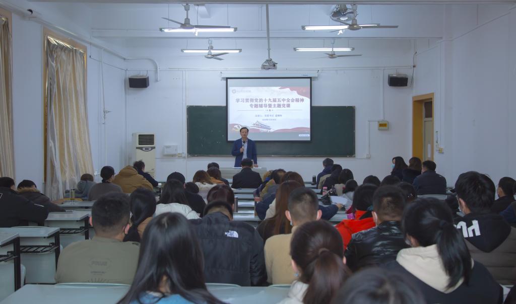 12月18日下午,院(校)党委书记、学习贯彻党的十九届五中全会精神陕西高校党委宣讲团成员温锋科在雁塔校区为师生进行了党的十九届五中全会精神专题辅导暨主题党课。机关第一党支部、财经系教工党支部、财经系学生党支部全体党员及教职工、学生代表参加。财经系党总支书记、系主任孙莹娟主持。