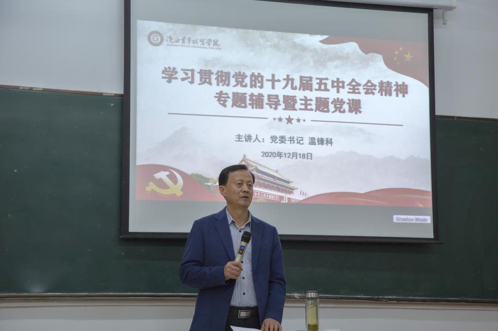 温锋科强调,一是全体师生要把学习宣传贯彻党的十九届五中全会精神作为当前的首要政治任务,在学深悟透、知行合一上下功夫,切实把思想和行动统一到全会精神上,强化使命担当,敢于建功立业,凝聚推动院(校)改革发展的磅礴力量;二是院(校)应当把党的十九届五中全会精神作为抢抓改革机遇、破解发展难题、着力深化内涵、提升育人质量的根本遵循,牢固树立大局意识,坚持真抓实干,打破僵化思维,敢于开拓创新,引领团校改革、新校区建设、老校区提升改造及两个“十四五”规划等院(校)当前重点工作稳步向前;三是教师党员要发挥先锋模范作用,牢记为党育人、为国育才使命,全面落实立德树人根本任务,了解青年、学习青年、服务青年、引领青年,做好新时代新形势下的青年党建工作和青年工作队伍建设,团结带领广大团员青年坚定不移跟党走,为全面建设社会主义现代化国家新征程提供人才支持。