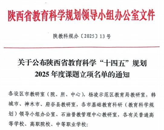据悉,陕西省教育科学“十四五”规划2025年度课题立项评审工作历经个人申报、单位审查、资格审核、专家评审等多轮次严格程序。此次学校3项课题的成功立项,是学校在教育科学研究领域的又一重要成果。